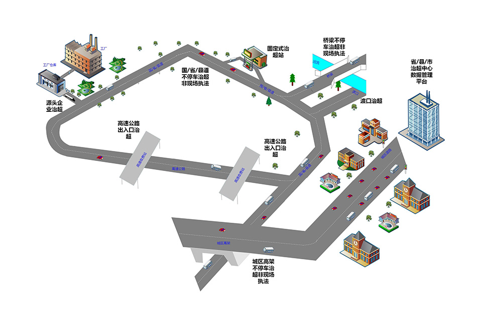 公路车辆AI治超及数字化管理平台系统通过部署在高速公路出入口、高速公路省界、重点国省道货运线路、跨江跨海大桥、城市高架桥、货源集散企业等多场景中,通过对货运车辆计量及AI分析,智能识别车辆超载违法行为,数据接入地市级、省级、部级等多级数字化管理平台中,最终实现货运车辆治超大数据统一管理、统一使用的目标。